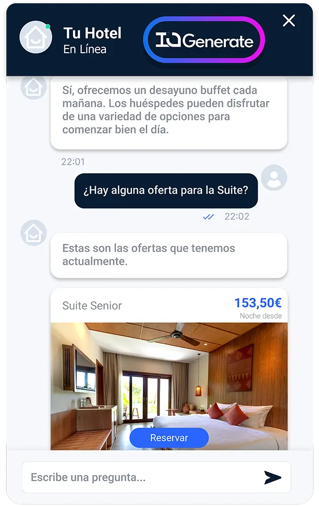 A diferencia de otros chatbots genéricos, nuestro asistente virtual comprende las necesidades únicas del sector hotelero. Prueba nuestro Chatbot en directo →